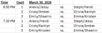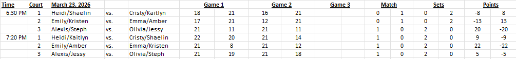 Join us for volleyball matches every Monday at Robert Strange Park, starting at 6:30 PM and 7:20 PM.